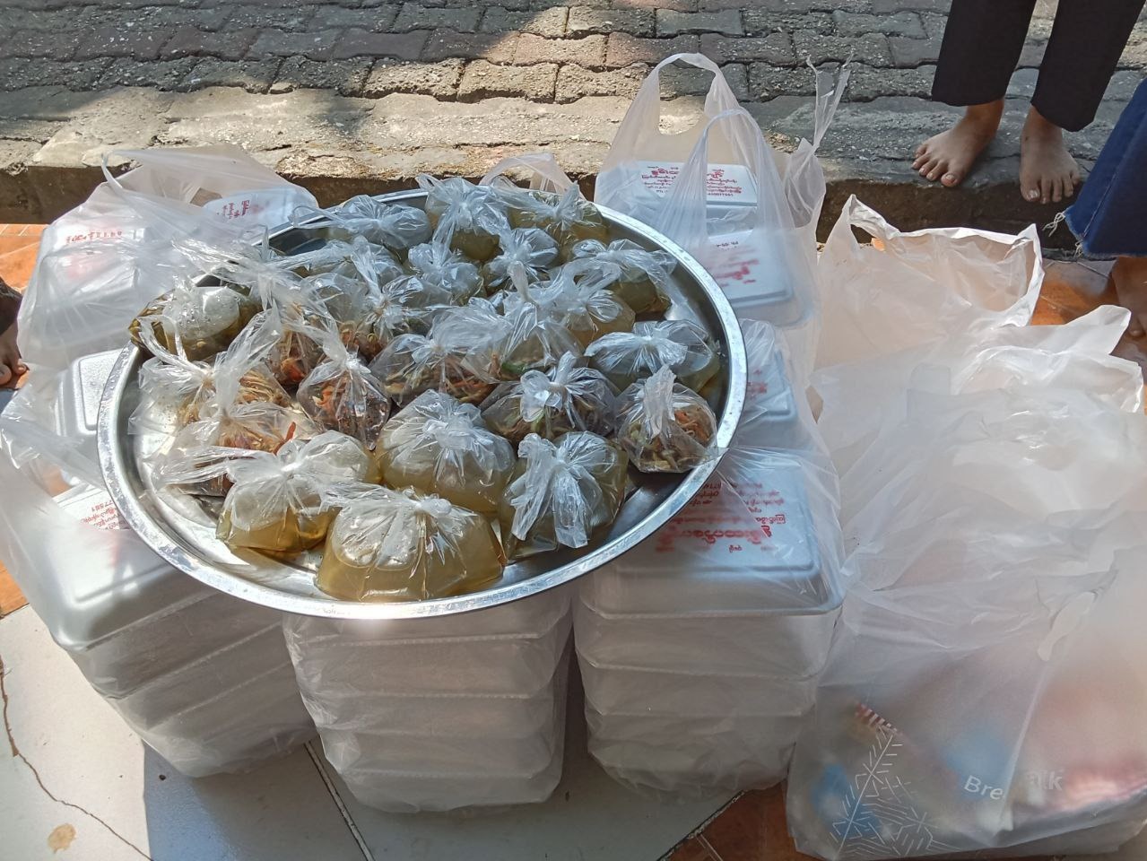 Donated chicken oil rice meals and watercolor painting materials.